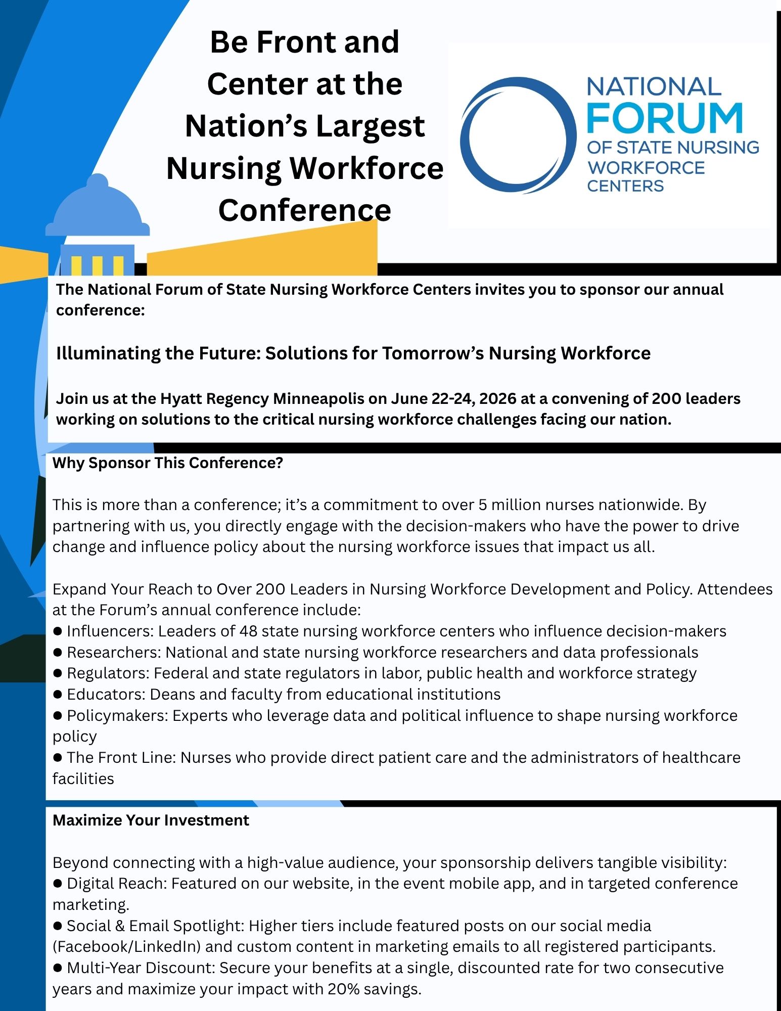 The National Forum of State Nursing Workforce Centers (National Forum) is excited to host our 2026 Annual Conference on June 22-24, 2026 at the Hyatt Regency located in Minneapolis, MN.